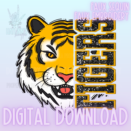 Trendy Faux Sequin/Embroidered GOLDEN TIGER Mascot DIGITAL DESIGN {black/gold}